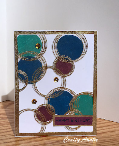 Although I don't have that same background stamp, I do have My Favorite Things Party Patterns which has similar images. I figured I could recreate this card no problem, I'd just have to stamp the circles separately. How hard could it be? Well, first off, I only had two different sizes of the outline circles, which made me have to really think about placement of all the circles since the above card had several different sized circles. Also, I wanted to enter ColourQ Challenge #351, so I decided to make my circles gold. Then I got fancy and decided to emboss them in gold. Well, I did use an embossing buddy before I embossed, but the pretty gold ep left a shimmery film EVERYWHERE on my card. Not the look I was going for, but the card was still usable, so I continued on by adding my bold SU inks for the inside of the circles. I have such a love-hate relationship with these ink pads! I LOVE the coverage you get and all the pretty colors, but I just can't seem to use them without making a big inky mess of things. I'm getting the hang of tapping lightly, but I need to be more careful and not get my fingers all inky because I end up ruining my cards. After all my planning and embossing and stamping, my card was filled with inky splotches. UGH! Rather than start over, I decided to cut out all the white (and white-with-ink-splotches) out and paste this fussy-cut image onto a card base that I adhered a gold frame to. But when I went to put my sentiment in the perfect spot, I realized I had pasted my image on UPSIDE DOWN. UGH!! Now I had to cut the card front off and paste it onto another card. It's a little thick, but now I was able to put the sentiment right where I wanted it, so I am quite happy with the result. But holy moly did it take me a long time to finish this!! I will try this background again - I am sure it will be much quicker if I don't emboss and also if I remember to be more careful when stamping! Thanks for stopping by!